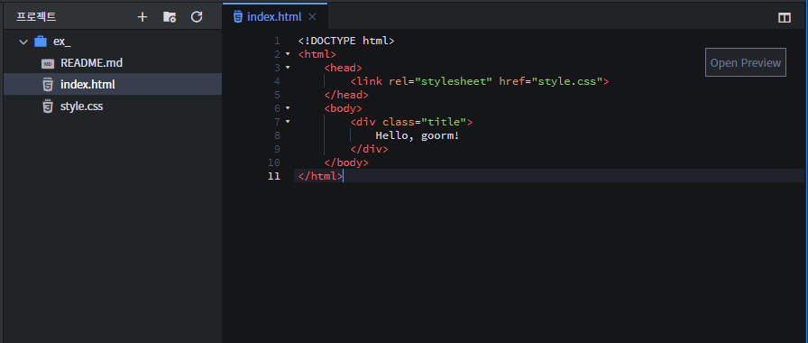 이런 식으로 기본적인 코드가 쳐져있으며 오른쪽 상단에 보는 Open Preview를 통해 미리볼 수도 있다.