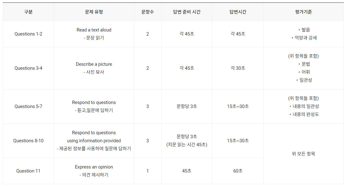 문제 구성은 위와 같고, 특히 전 문항에 대해서 "발음, 억양, 강세"가 평가기준으로 들어갑니다.