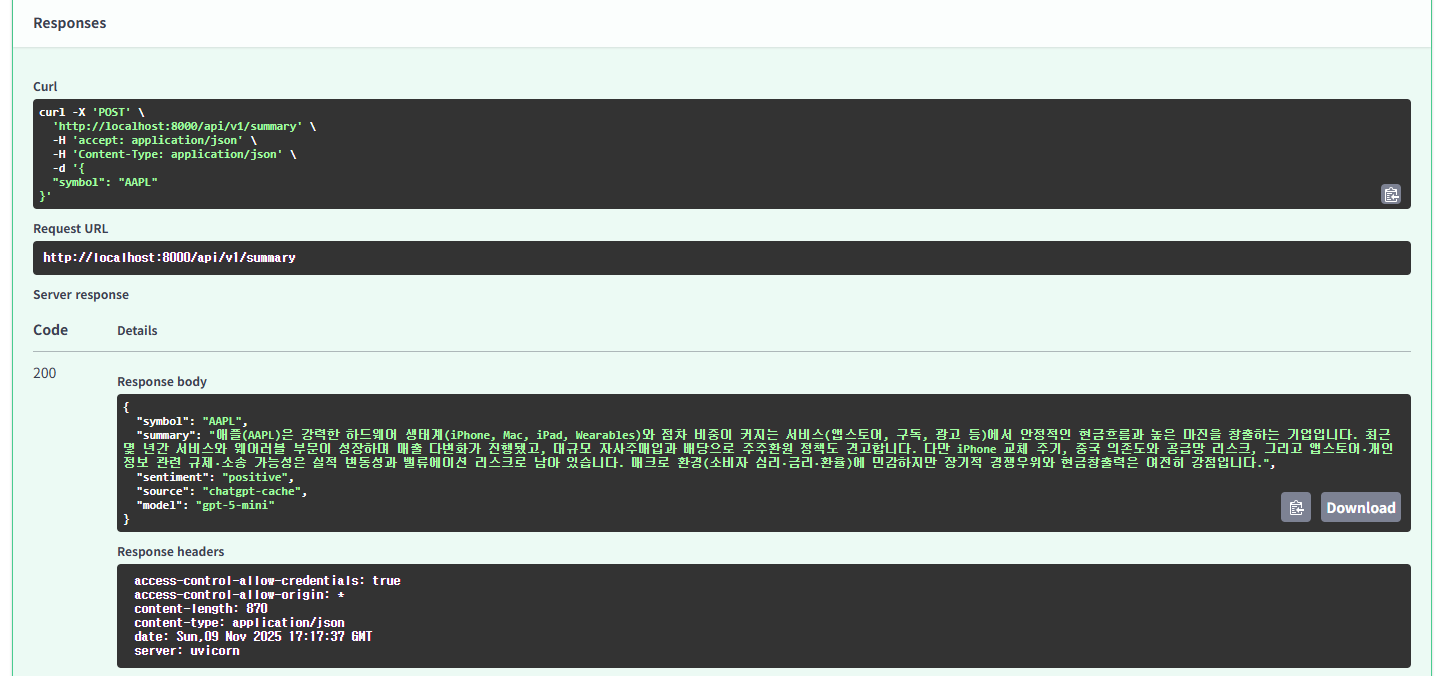 - 전달 받은 종목을 Chatgpt API로 호출하여 최신 뉴스를 약 3~5줄 정도로 요약 및 긍정/부정을 검토
