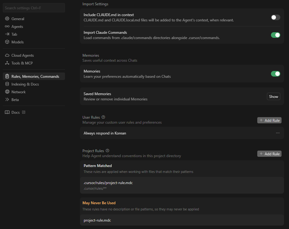 1. Cursor Settings을 연 후, [Rules,Memories,Command..] 탭으로 이동 및 Project Rules에서 [+Add Rule] 버튼을 선택합니다. 그리고 필요한 프로젝트 룰 네이밍을 적 Rule을 생성합니다.